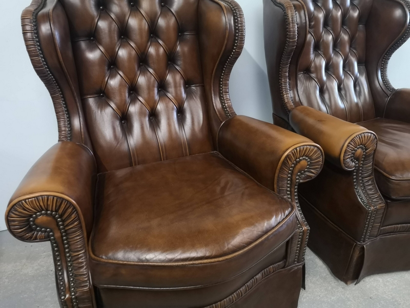 Premièrement, cette paire de fauteuils chesterfield est en cuir marron, ils sont capitonnés au dossier.
