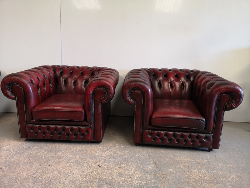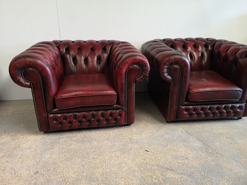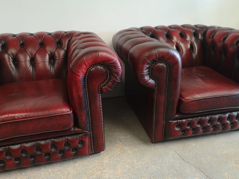 Premièrement, c'est une vrai paire de fauteuils chesterfield, le cuir épais bordeaux est patiné et ciré.